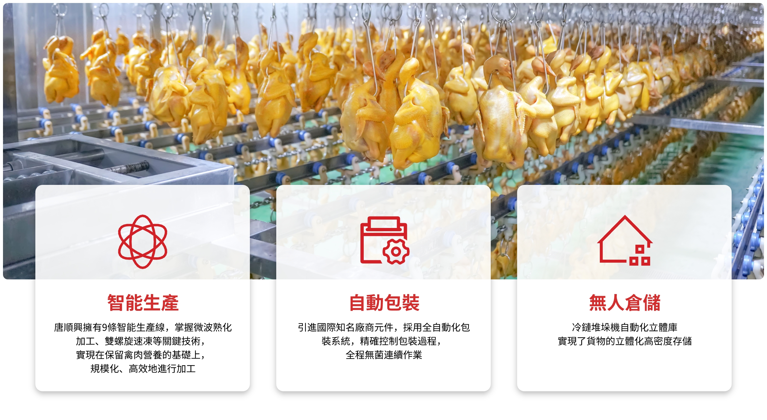 唐順興十萬級淨化無人車間融合了先進的資訊技術、自動化技術、物聯網等技術,搭建起智能化、規模化的禽肉加工系統